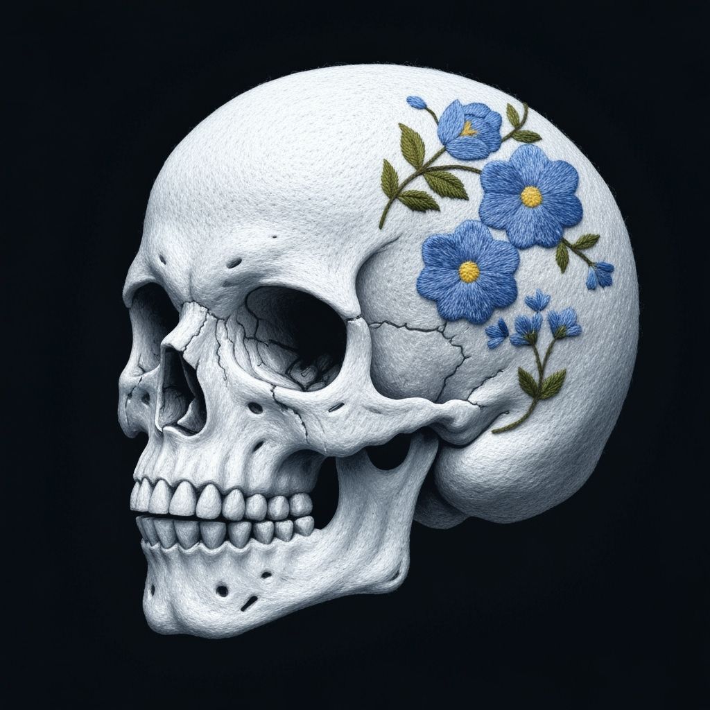 This image shows a white skull interwoven with vibrant blue floral needlework. The embroidery creates a luminous fantasy effect, highlighting the delicate yet contrasting elements.