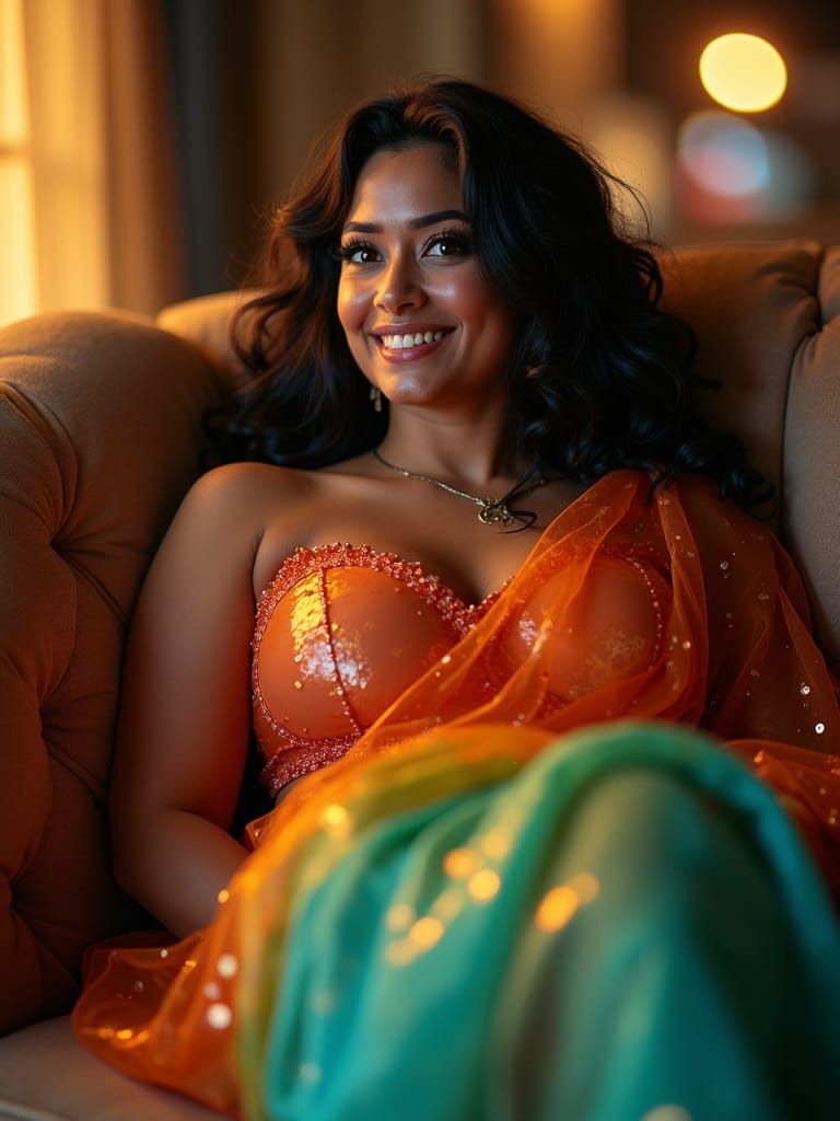 A captivating image of a curvy Indian woman in a rainbow latex saree. The portrait, with dramatic lighting and painterly shadows, highlights the beauty of the figure in a cyberpunk aesthetic.