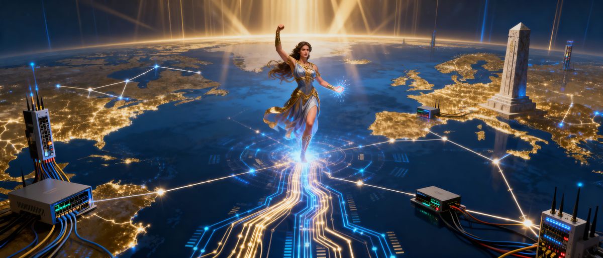 This image shows a photorealistic digital goddess in a heroic pose amidst a glowing network map. Data routes and fiber-optic cables surround her, with advanced tech resembling monuments. The scene features cinematic sci-fi fantasy lighting in rich blues and golds.