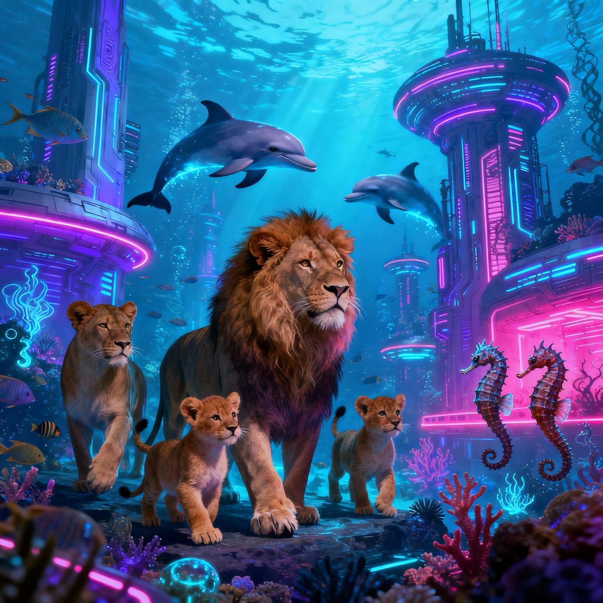 This image depicts a pride of lions with cubs, alongside dolphins and seahorses, in a futuristic underwater city. The scene features vibrant neon and bioluminescent lighting with a synthwave aesthetic.