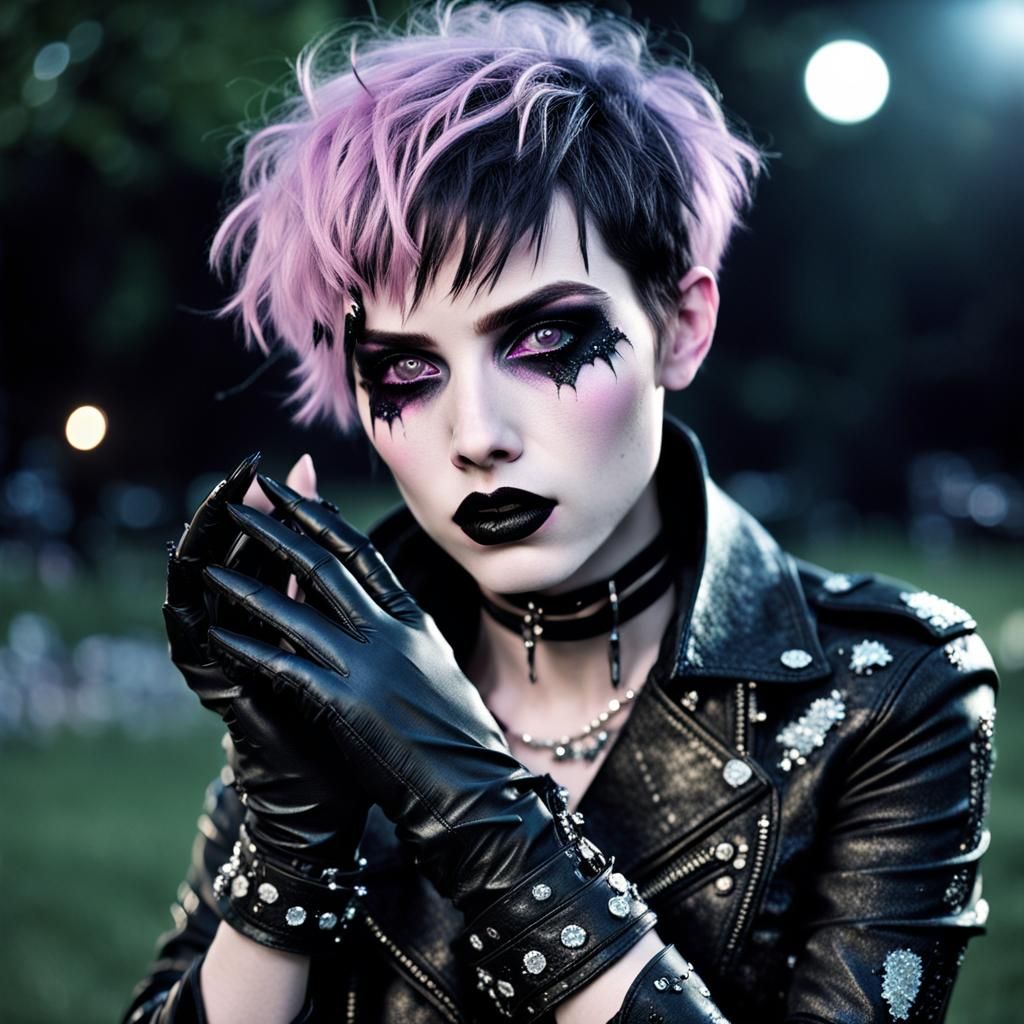 A gothic vampire stands in a park at night. The figure is a slender, short-haired woman with pastel pink makeup and black lipstick, dressed in ripped denim, rendered with dynamic lighting.