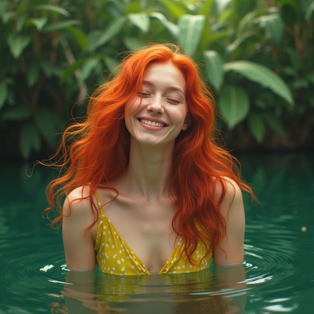 This image shows a red-haired woman amidst lush greenery and calm water, radiating happiness and contentment. The image is reminiscent of vibrant, expressive digital art.