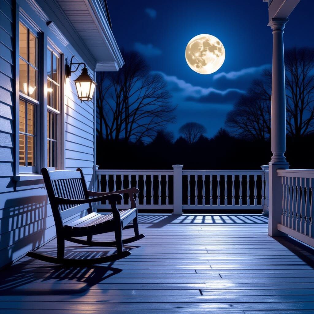 This image shows an empty porch bathed in the soft glow of moonlight. A solitary seat is visible, creating a serene and inviting atmosphere.
