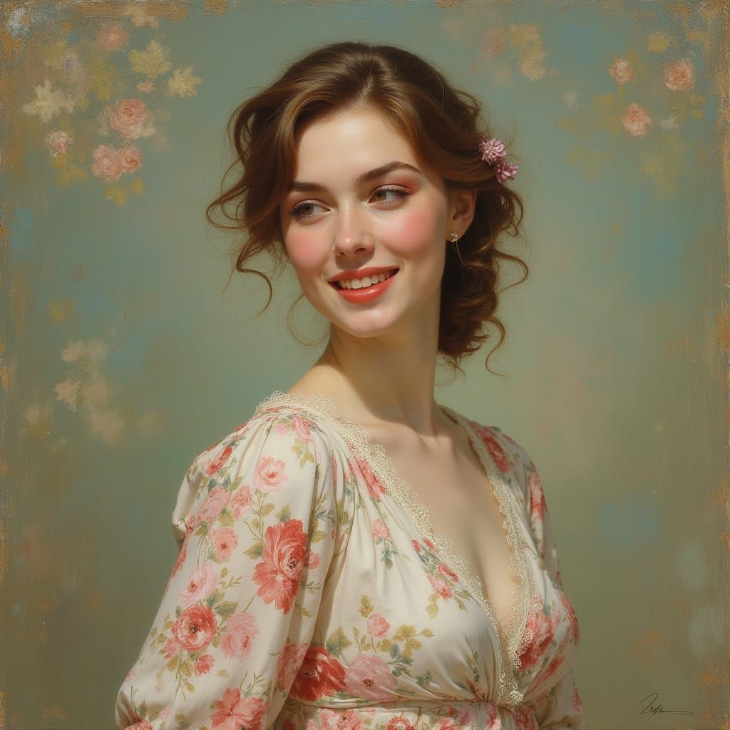This serene image captures a radiant woman in a soft, spring-inspired dress, reminiscent of Impressionist masterpieces. Delicate flowers and subtle brushstrokes evoke a sense of quiet refinement, as warm sunlight and gentle shadows come together in a tranquil scene.