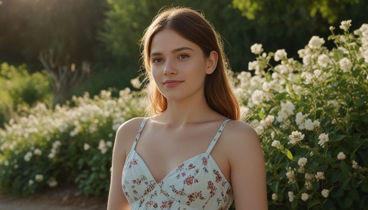 A medium shot shows a woman in a sundress surrounded by flowers. Captured in hyper-realistic detail, the digital art features a pastel color palette and warm sunlight, enhanced by soft bokeh.