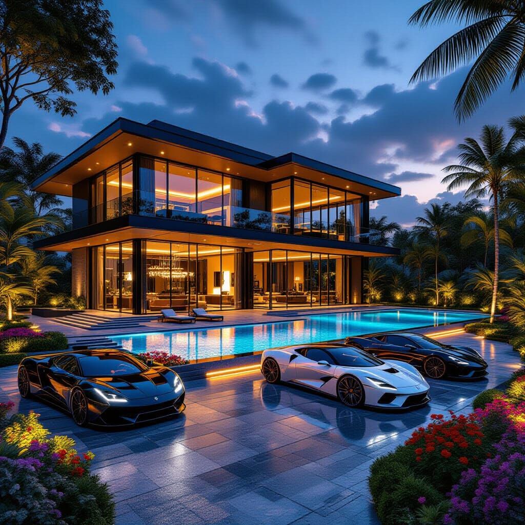 A stunning night view of a luxury mansion featuring a glass facade, infinity pool, and gardens. Warm lighting creates a golden glow on the grounds and parked cars.