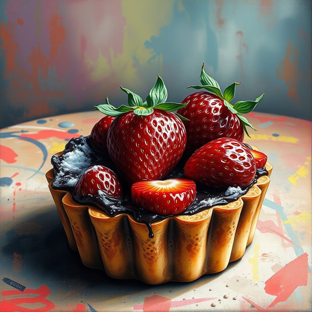 This image shows a richly detailed, impressionist-style painting of a decadent strawberry tart, created with thick brushstrokes and textured gouache, set against a vibrant, polychromatic background.