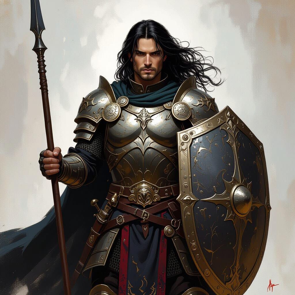 This image shows a paladin in an impressive stance, clad in detailed armor and wielding a spear and shield. The scene evokes a dramatic fantasy aesthetic with digital painting elements.