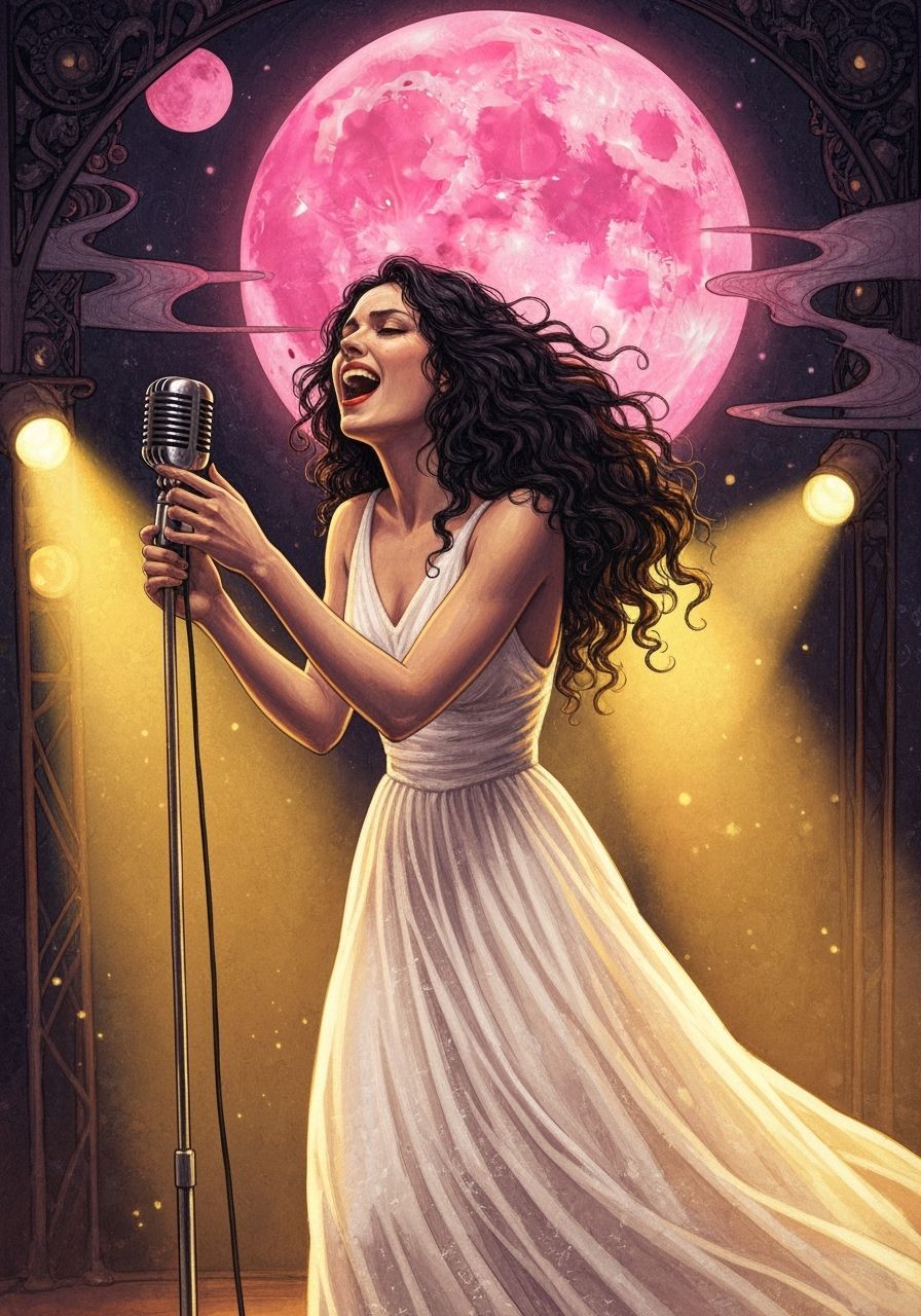 A vibrant image showing a woman singing into a vintage microphone, illuminated by stage lights under a pink moon. The artwork evokes art nouveau with intricate brushwork and a nocturnal atmosphere.