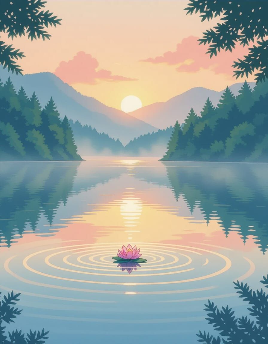This image shows a tranquil mountain lake at sunrise, with mist gently rising and reflecting pastel colors. A lotus flower floats on the water amid ripples, with soft light filtering through a calm forest in a vintage anime aesthetic.