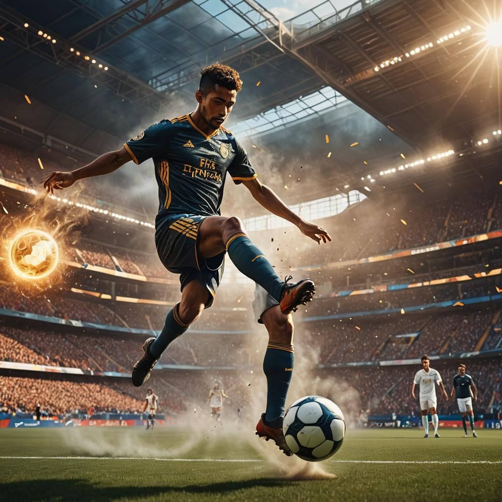 A vivid close-up of a soccer player kicking a glowing ball in a stadium full of people. The image features dramatic lighting, mist, and intricate textures as a detailed matte painting.