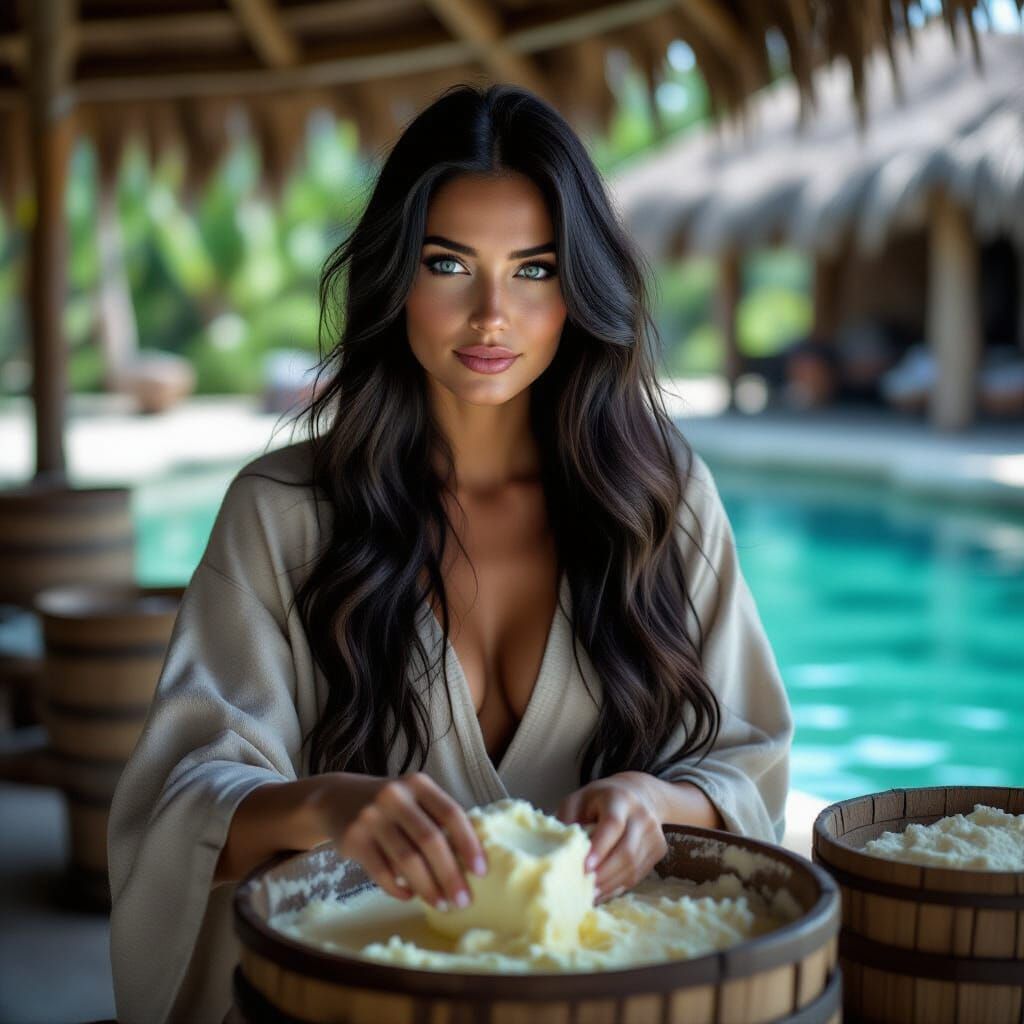 This image shows a lady farmer with flowing black hair and piercing blue eyes churning butter. The scene is set against a vibrant backdrop with dramatic, atmospheric lighting, reminiscent of a cinematic film still.
