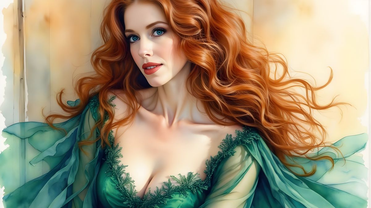 This image shows a beautiful woman with auburn hair in a flowing emerald silk dress. Rendered as a watercolor painting with soft, blended colors and visible brushstrokes, evoking movement and emotion.