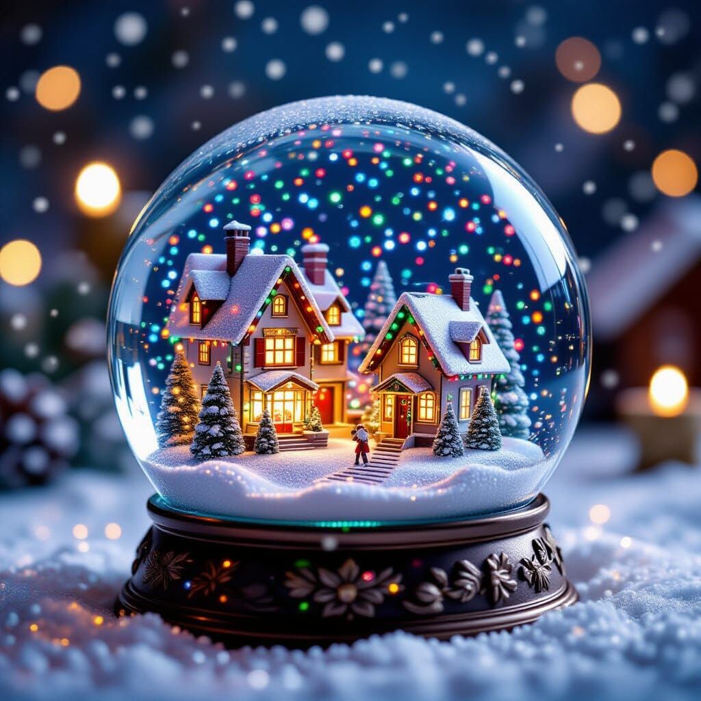 This hyperrealistic image showcases a detailed snow globe with a miniature village, featuring houses illuminated by colorful, twinkling lights and gentle, sparkly snowfall. Captured with macro lens detail and studio lighting.