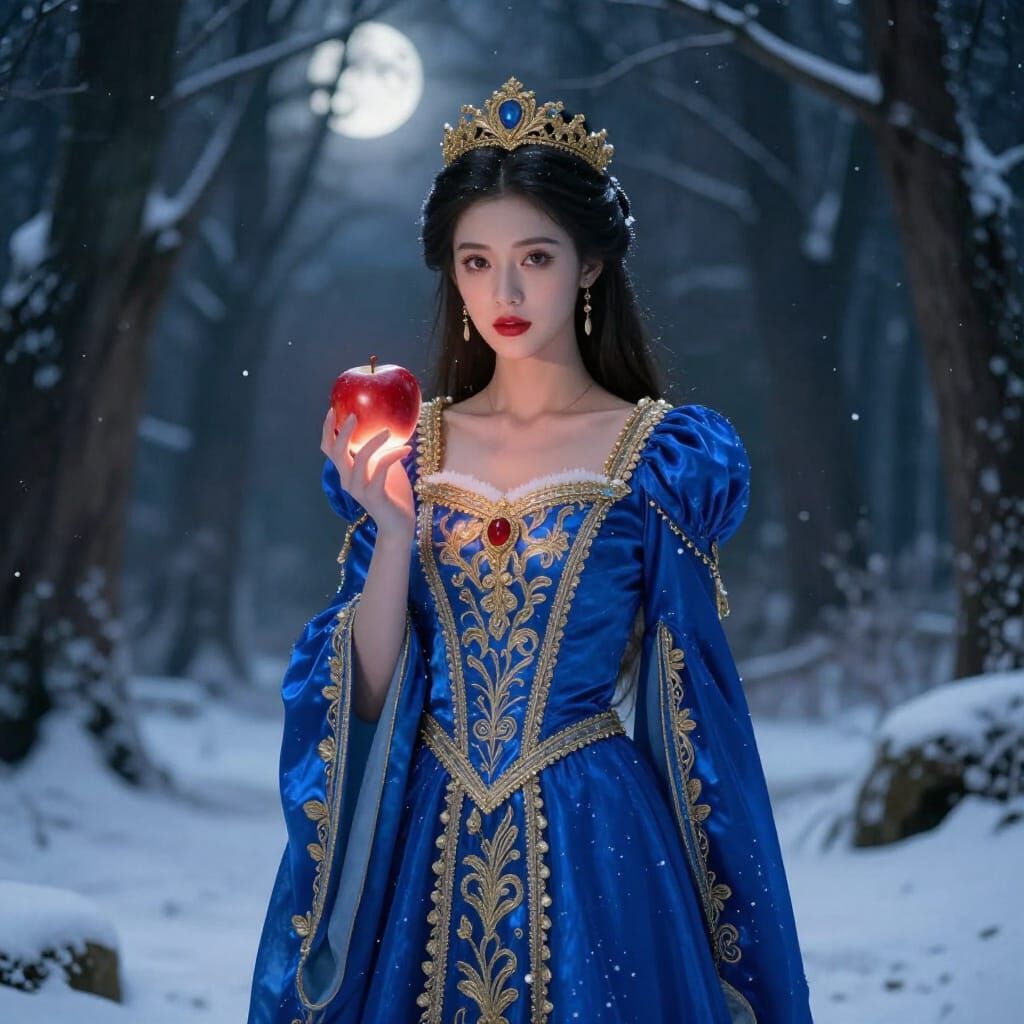 A mysterious princess in a regal sapphire gown with gold embroidery holds a glowing red apple in an enchanted moonlit forest. Cinematic realism with fantasy elements and dramatic lighting.