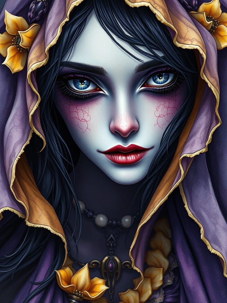 A detailed watercolor painting of a Tim Burton-esque bride. Features intricate facial details, tattered garments, and dramatic lighting with purple and yellow hues, in a dark fantasy aesthetic.