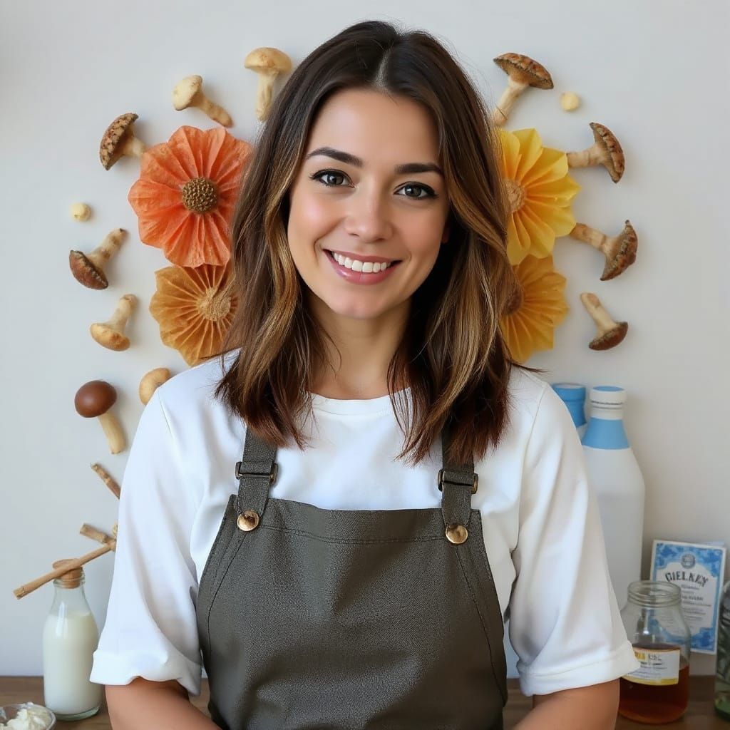 This image shows a smiling, brown-haired woman in a bartender's apron posing with mushrooms, honeycombs, rum, and milk bottles. The image is in a sensual realism style with vibrant colors and delicate lines.