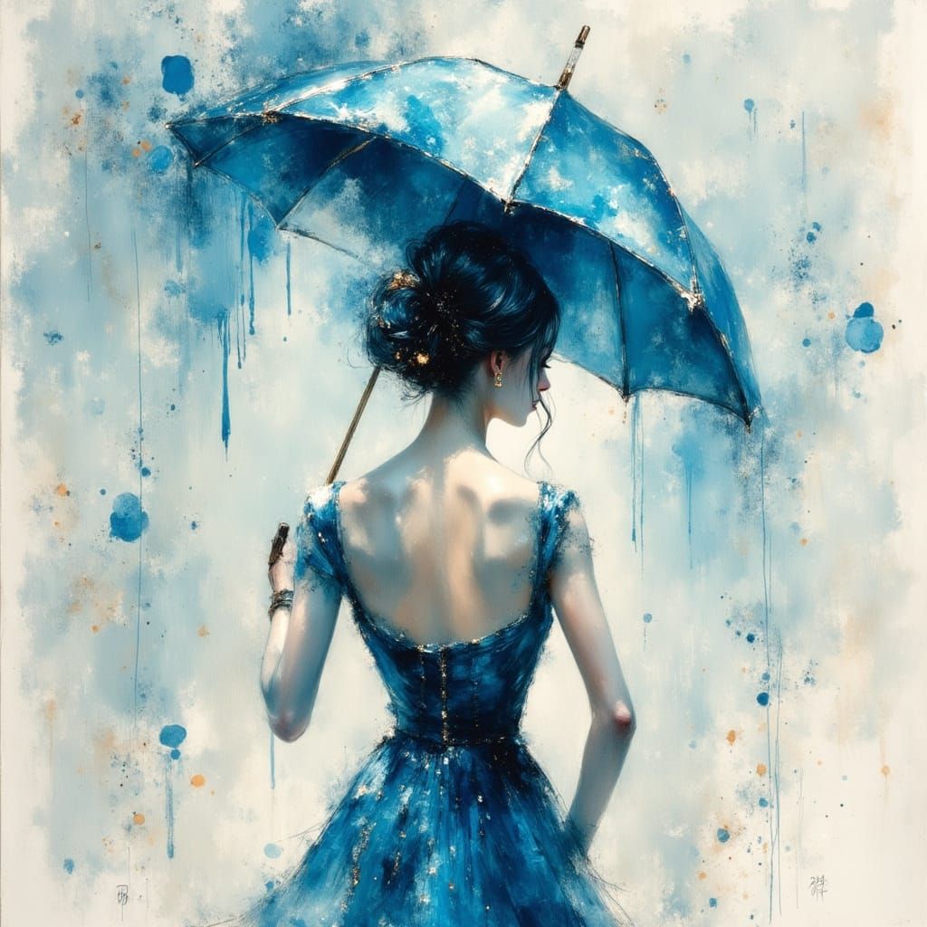 This image showcases a woman holding a blue umbrella, rendered with bold palette knife strokes. The artwork features a serene palette of light cyan, gray, dark blues, and gold, evoking timeless elegance.