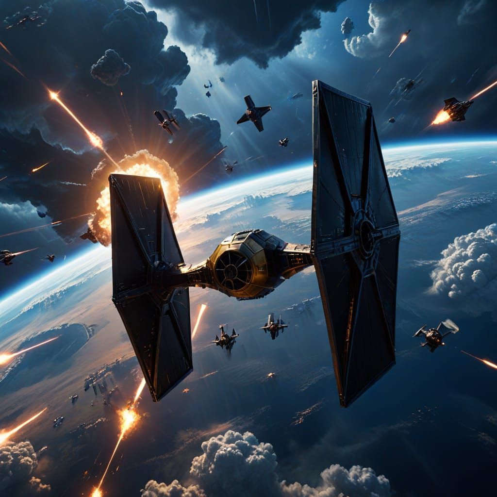 This image shows a black Imperial Tie Fighter looming above Earth. The cinematic shot features reflective metallic surfaces, ominous clouds, a vibrant blue atmosphere, and golden hour lighting in a Star Wars aesthetic.