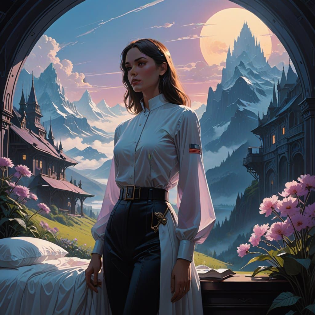This enchanting scene depicts a serene Russian soldier in a fog-shrouded bedroom surrounded by a dreamlike landscape with glowing flowers and a radiant crystal spire. Inspired by surrealistic styles, this digital art invites you to step into a mystical realm.