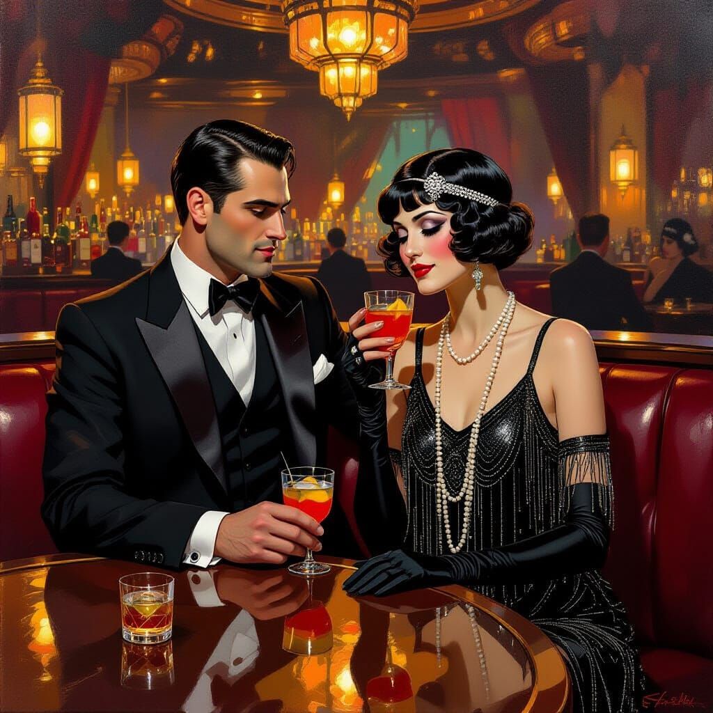 This image shows a mob boss in a suit and a flapper in a beaded dress drinking cocktails in an art deco bar. The image is rendered as an impasto painting with dynamic lighting and 3D shading.