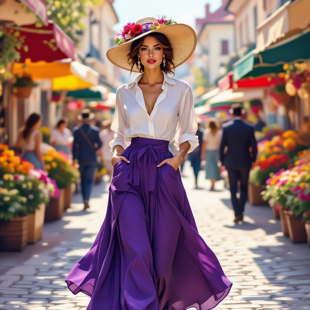 This image shows a stylish woman in a vibrant outdoor market. The artwork evokes impressionistic paintings with soft figures and colorful details, in a warm and inviting atmosphere.