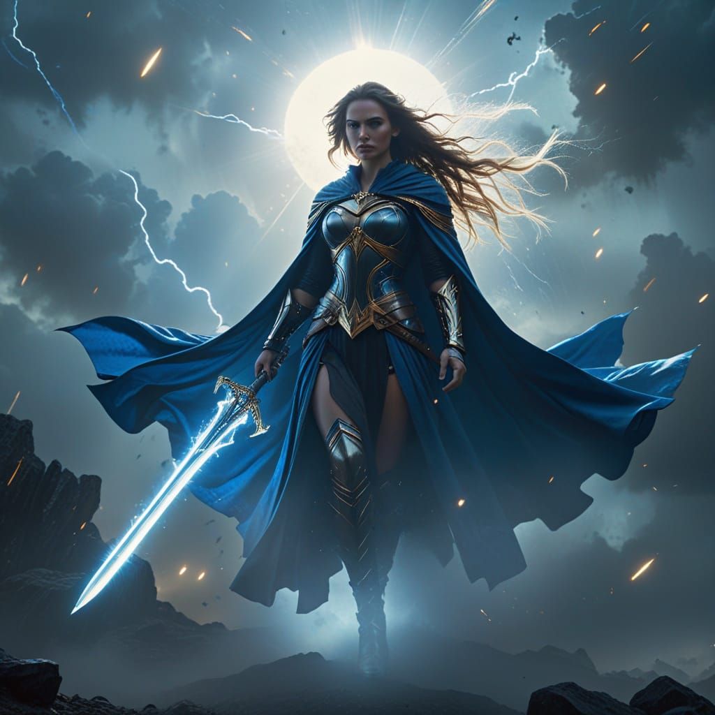 A cinematic image of a storm warrior sorceress in flight, clad in silver armor and a flowing blue cloak, with a glowing magical sword and intricate runes, set against a dramatic golden hour sky with film grain and lens flare