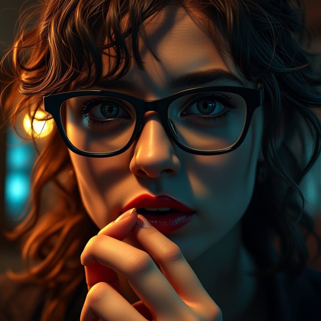 This image shows a woman with curly hair and glasses in a cinematic style. The portrait captures an intimate atmosphere with warm lighting and high-fidelity details, reminiscent of 3D rendered graphics.