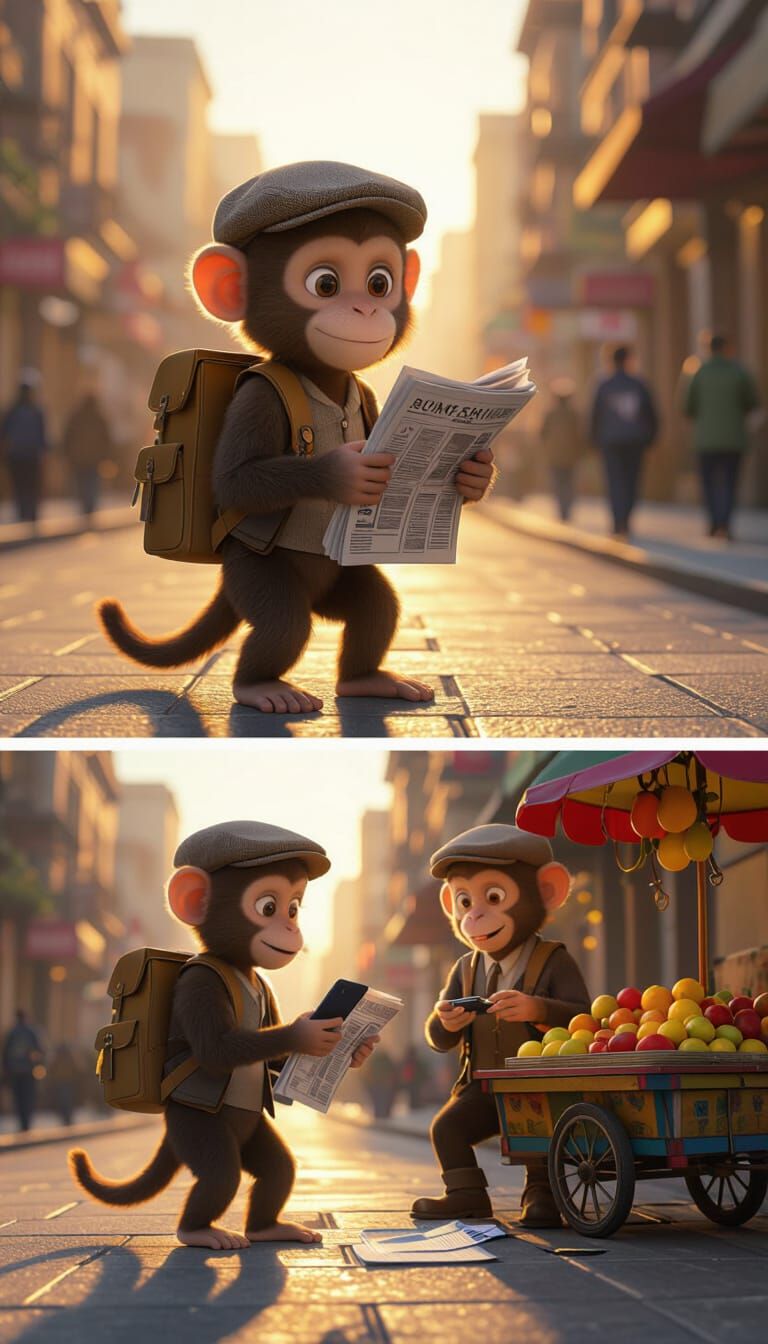 This image shows the life cycle of a monkey in a bustling city, rendered in a 3D animated style. It captures the journey from youth to old age with cinematic lighting and emotionally expressive designs.