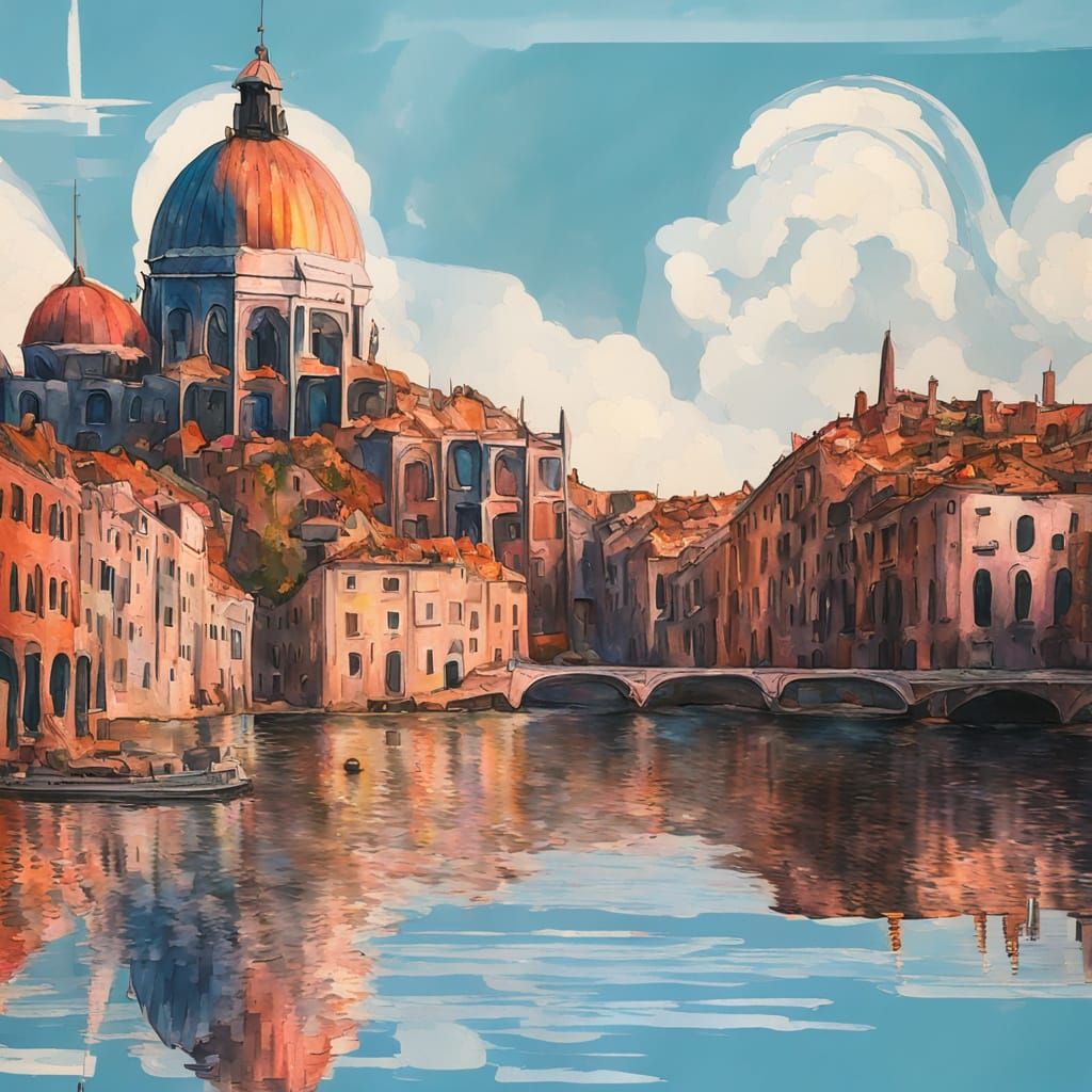 A vibrant floating city inspired by Venice. This neo-impressionist and expressionist image evokes dreamlike qualities through bold colors and dynamic brushstrokes. The maximalist cityscape features grand architecture and soft, feathery clouds.