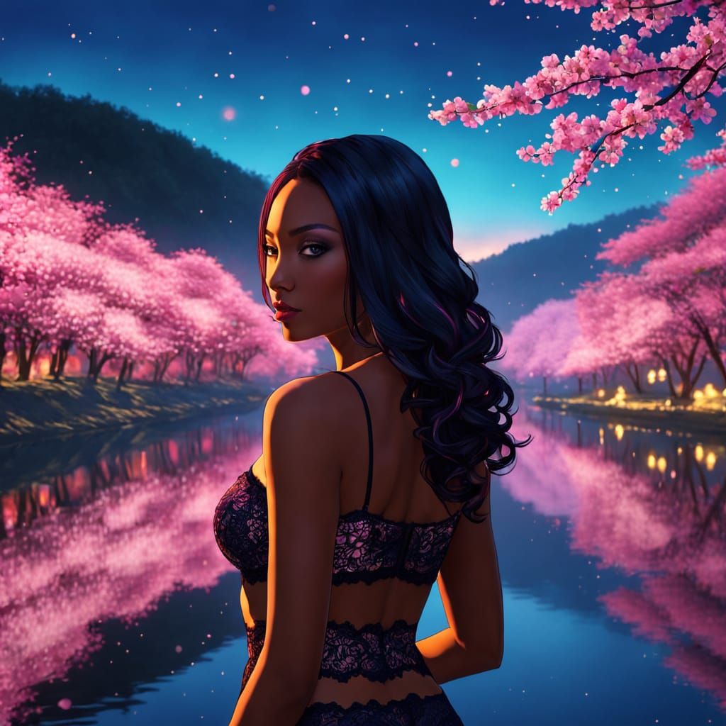 This image is a stunning cinematic film still of a beautiful African Japanese hybrid woman wearing elegant cherry blossom lace underwear, surrounded by a serene lake and lush cherry blossom trees, all bathed in warm, soft light and vibrant triadic colors.