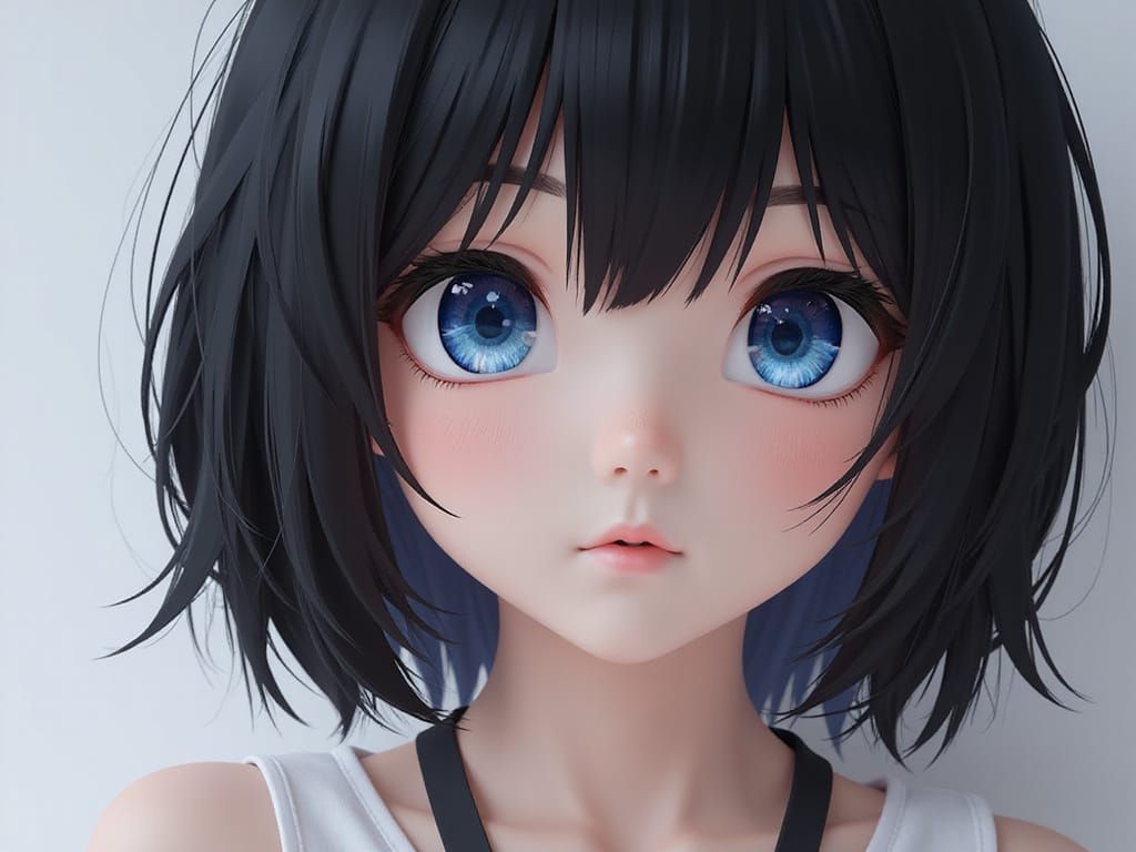 A closeup portrait of a realistic modern anime girl, short black hair, blue eyes, by artist "anime", 3d anime art, inspired by famouse anime design studios, extremely detailed, aesthetic, concept art, ultrafine detail, breathtaking, 8k resolution, modern 3D Render Engine
