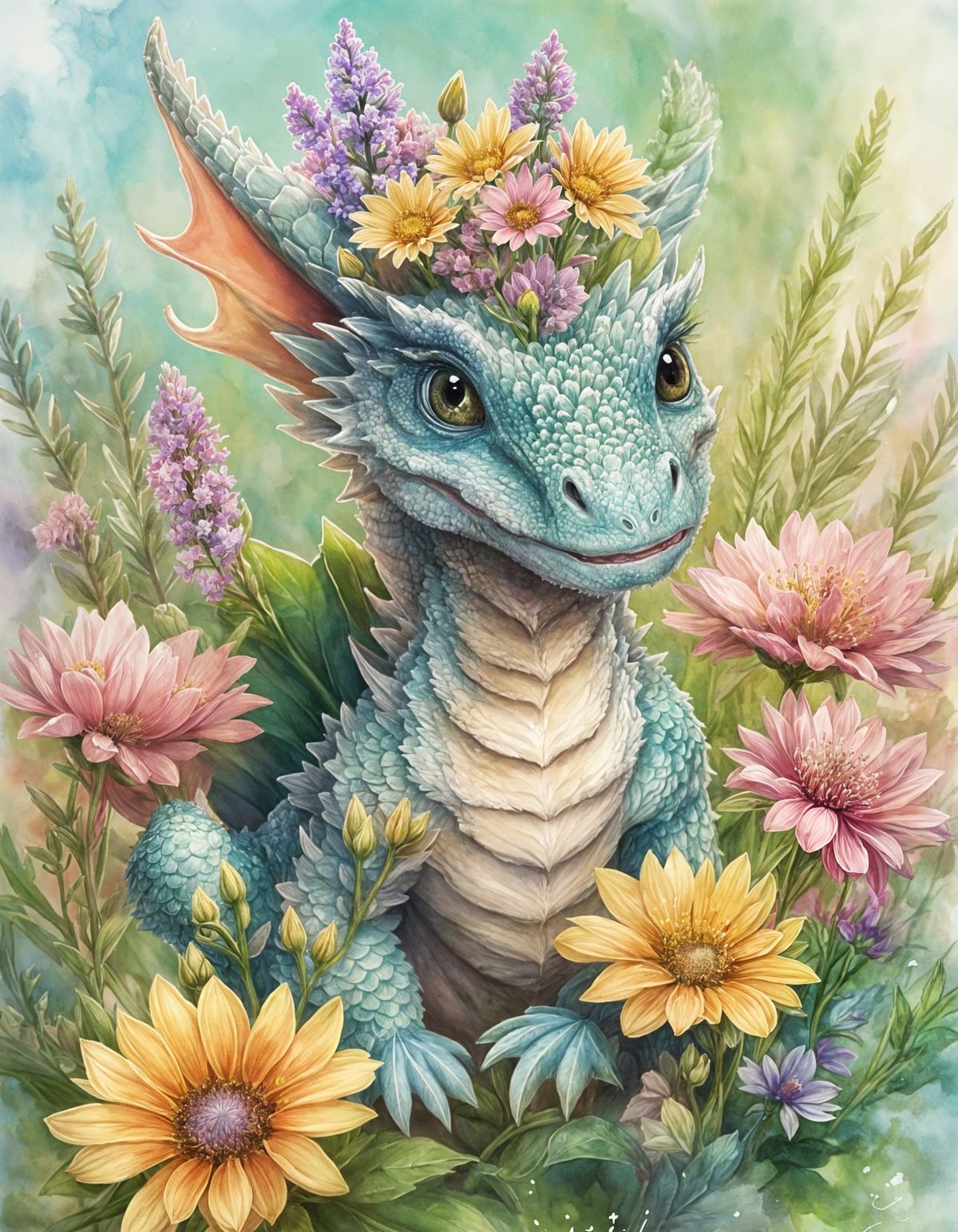 This image shows a detailed baby dragon holding a bouquet of wildflowers. Rendered in a pastel watercolor style with dynamic lighting and isolated on a pastel splash frame.