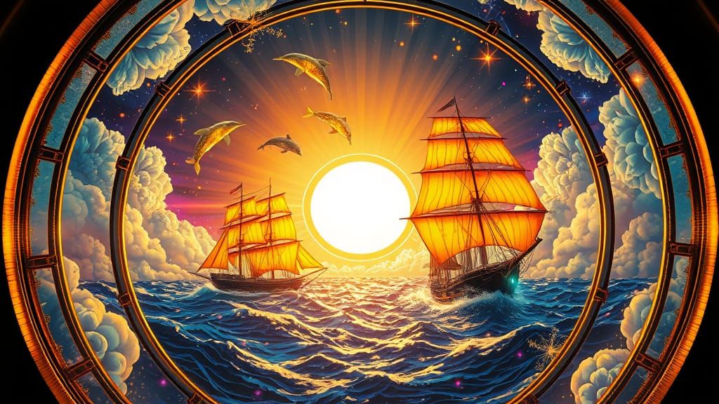 A striking picture of a cosmic scene viewed through a telescope. The image features neon flowers, a blazing sun, Chinese ships navigated by dolphins, and a golden sea serpent in a hyperrealistic style.
