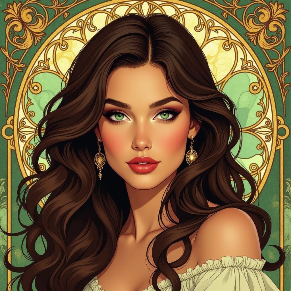 A portrait of a determined brown-haired, green-eyed woman. The image blends earthly colors with elegant lines and symbolic details, in a vibrant digital art style.