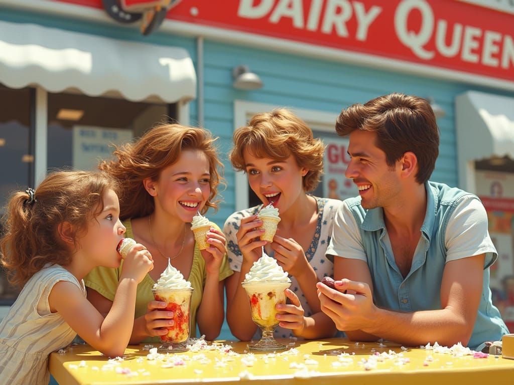 This image depicts a family joyfully eating ice cream at Dairy Queen, celebrating National Banana Split Day. Rendered with vivid details and textures in a classic, photorealistic style.