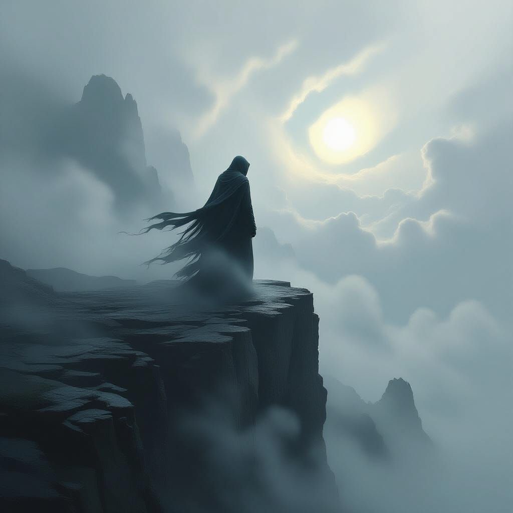 A dramatic image shows a misty figure atop a windswept cliff, surrounded by swirling light and shadow. The artwork features intricate textures and atmospheric depth, in a digital art style.
