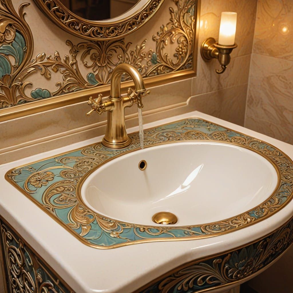 This image shows an ornate Art Nouveau washbasin in De Hallucinatie Restaurant. Intricate ceramic patterns, golden accents, and a soft pastel color scheme evoke vintage elegance.
