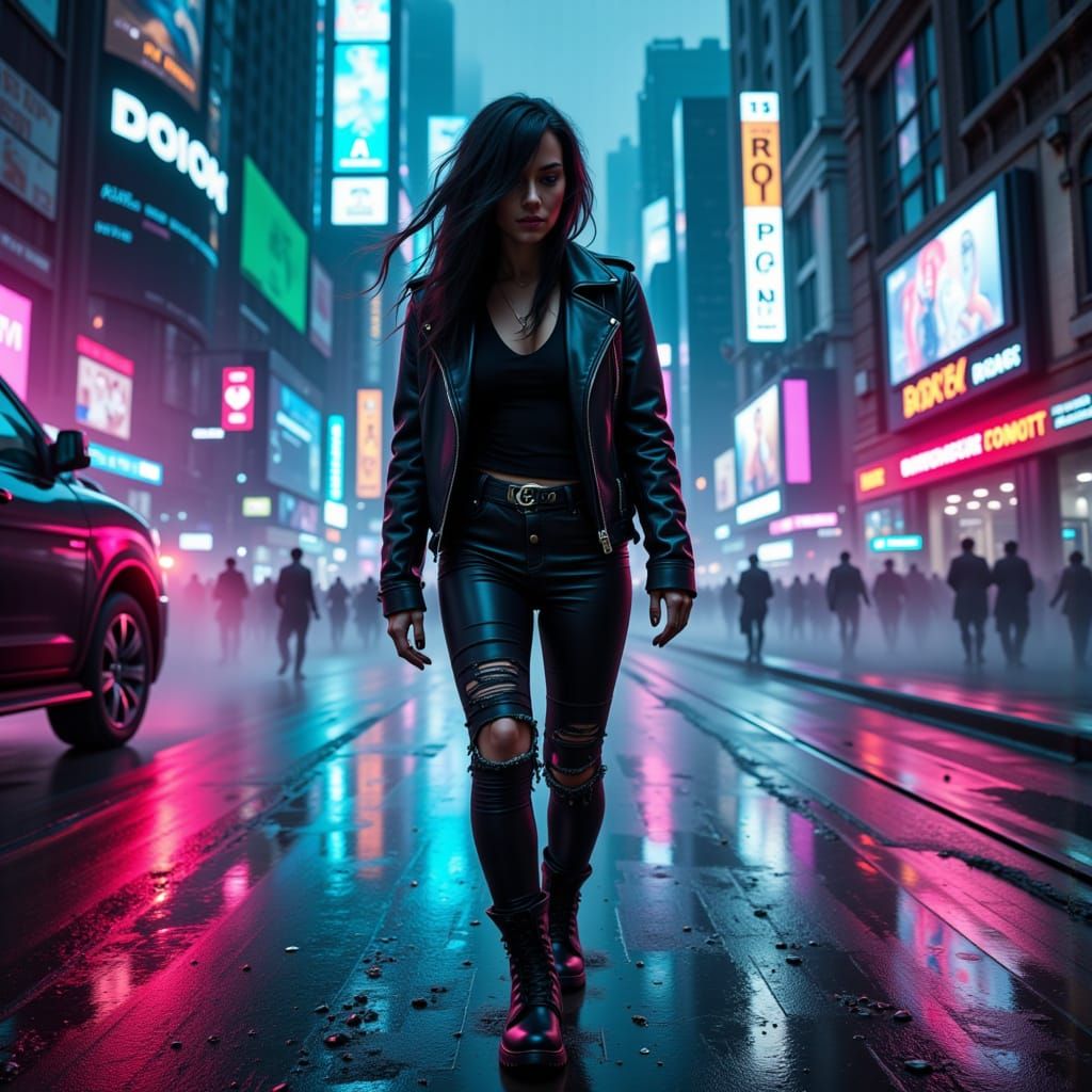 This image shows a cyberpunk woman walking on a wet city street at night. The futuristic cityscape features glowing neon and holographic advertisements in a cyberpunk aesthetic.