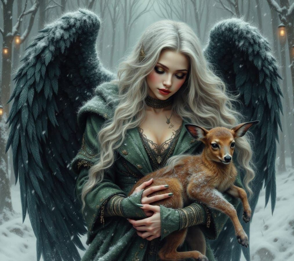 This image depicts a serene scene of an angel cradling a sleeping doe, shielding him from a snowstorm with her majestic wings. The oil painting is characterized by intricate details, cinematic lighting, and a tri-tone color palette, evoking a sense of drama and protection.