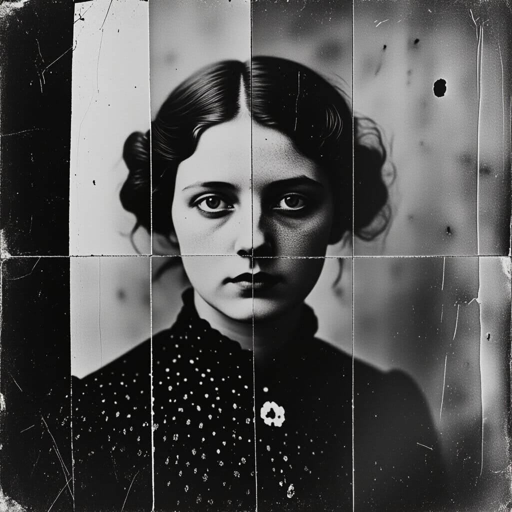 This image presents a faded, grayscale antique photograph with a dreamy, glitchy aesthetic. It evokes a sense of found art and grunge surrealism.