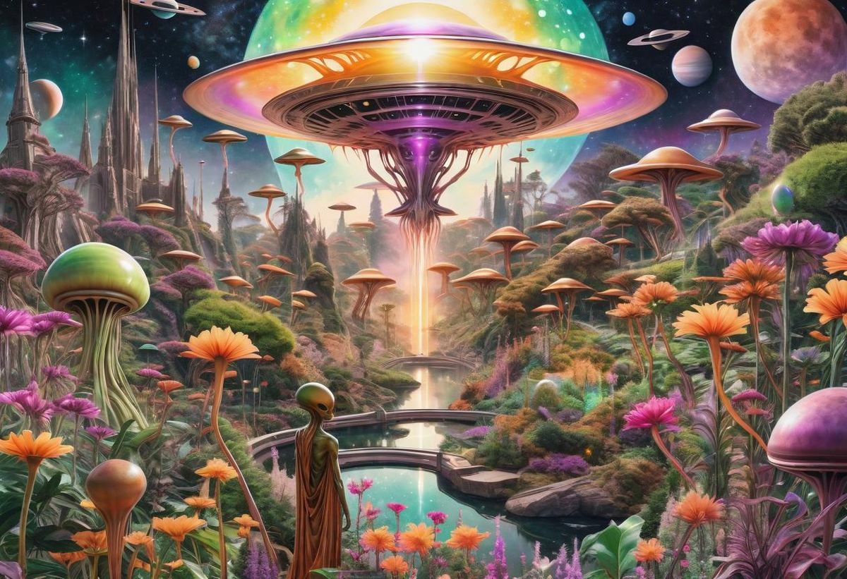 This image shows a vibrant alien pleasure garden filled with beautiful humanoids in diaphanous clothing. The background features alien flora, architecture, and moons under a starry sky, rendered as digital watercolor art with flowery pastel colors.
