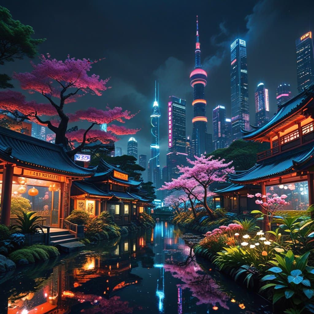 This image depicts a futuristic cityscape with lush gardens and parks, blending natural beauty with urban technology in a colorful and wondrous utopia.