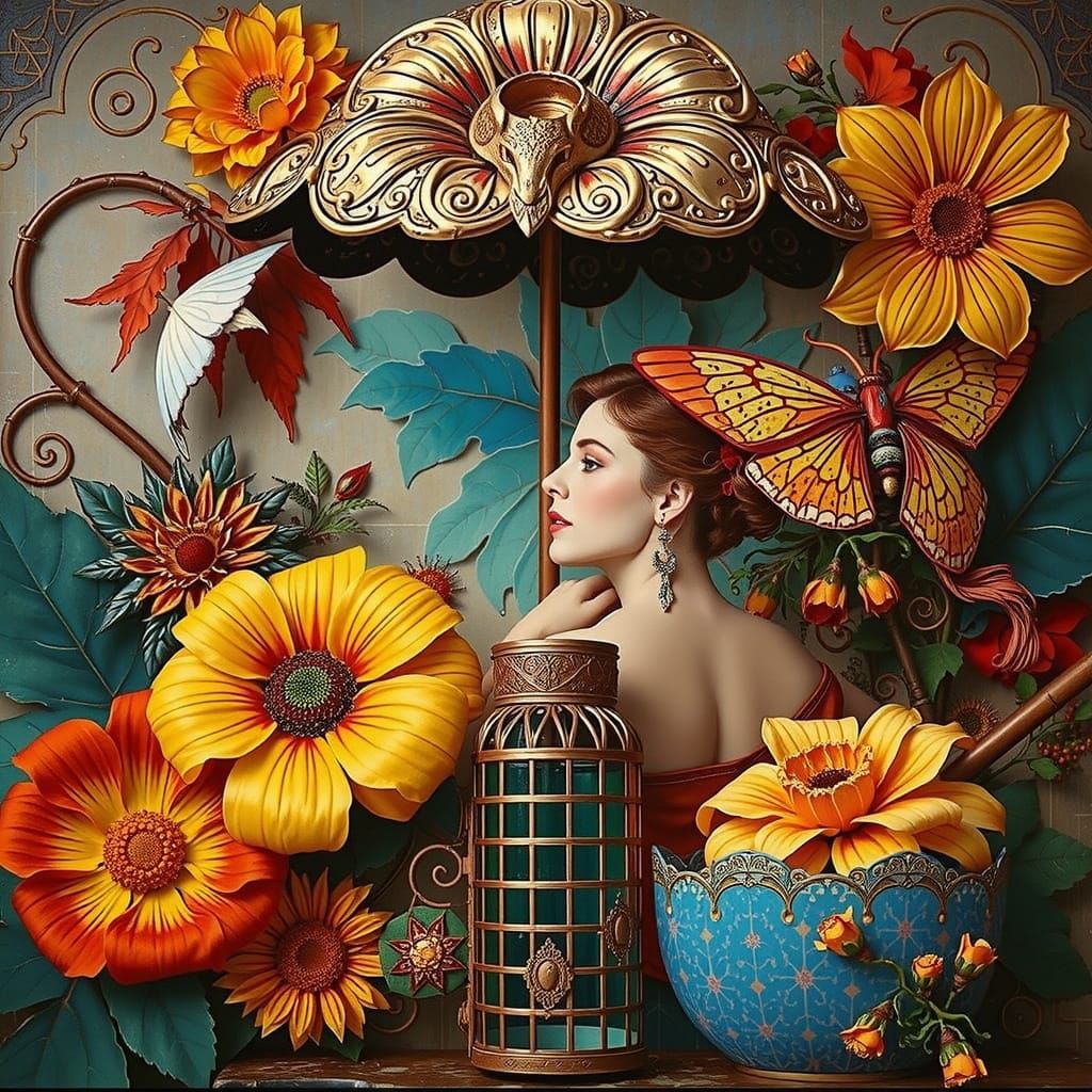 A vibrant portrait of Louis Majorelle amidst nature's embrace. The artwork showcases organic curves and metalwork, reminiscent of Art Nouveau with influences from the era.
