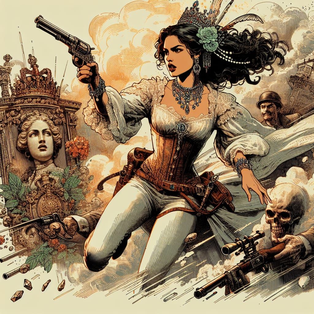 Create an elaborate full-length image of an attractive Hispanic woman involved in a dynamic action scene, which is the heist of the crown jewels. The scene should offer a blend of steampunk themes with a touch of Baroque-inspired realism and graphic novel styles. Utilize the techniques of chiaroscuro ...
