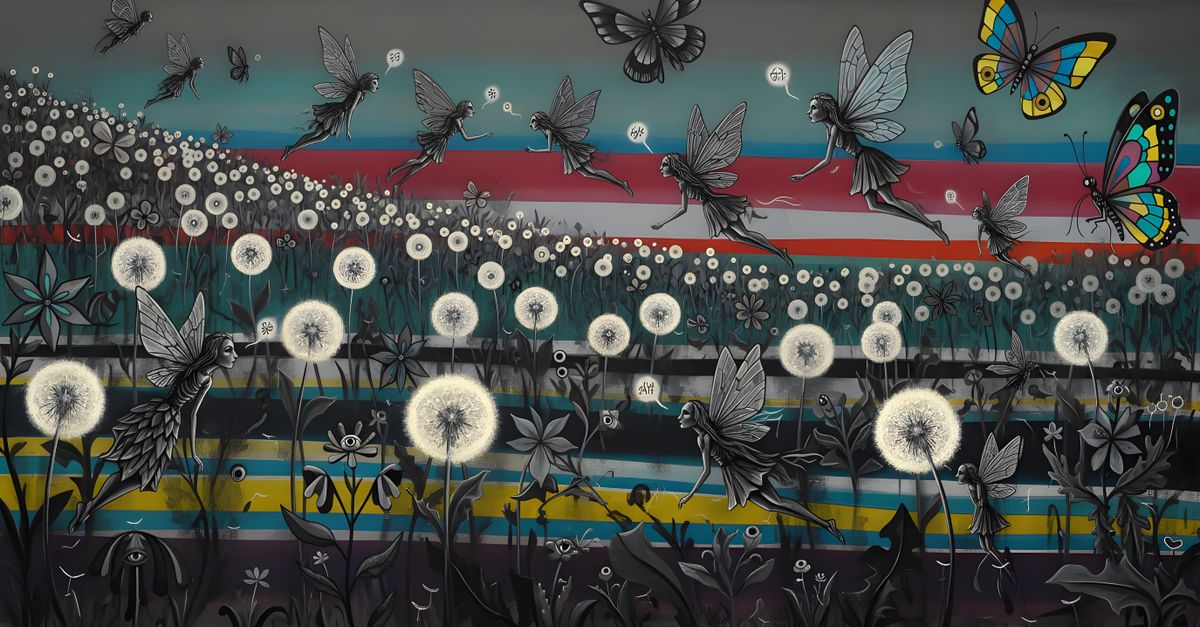 A vivid image of fairies in a dark meadow filled with dandelions. This abstract art piece features colorful details, butterflies, and flowers in a surreal, dreamlike scene with integrated flowing composition.