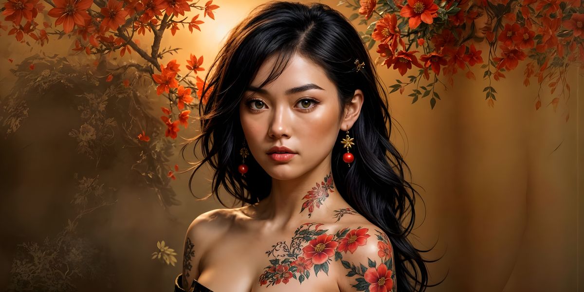 This image shows an East Asian woman in a red kimono with black ink tattoos, standing confidently. The background features classic Japanese art elements in warm earth tones. The image is in a digital realism style.