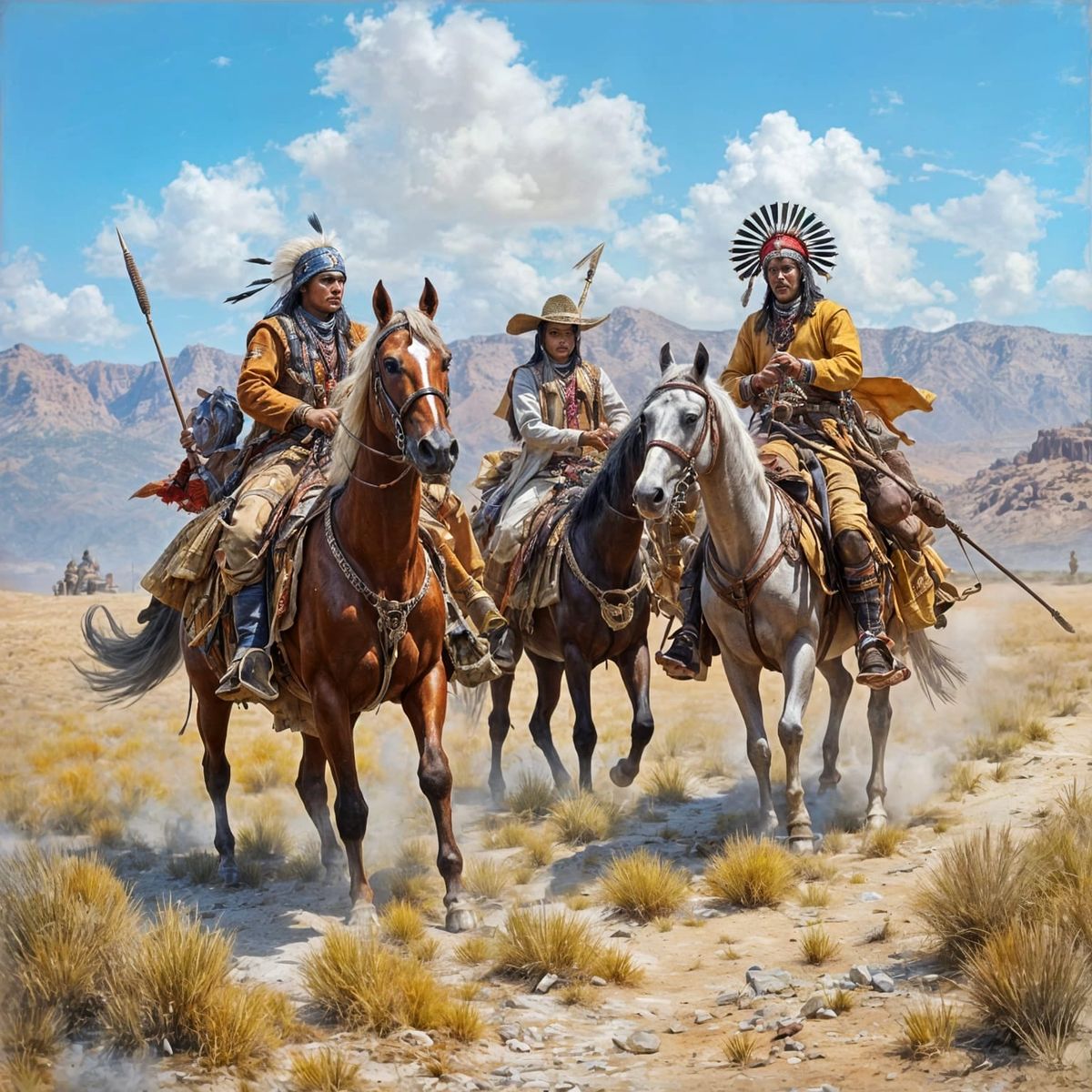 A vibrant painting of Native American warriors on horseback. The artwork captures a classical Western aesthetic.