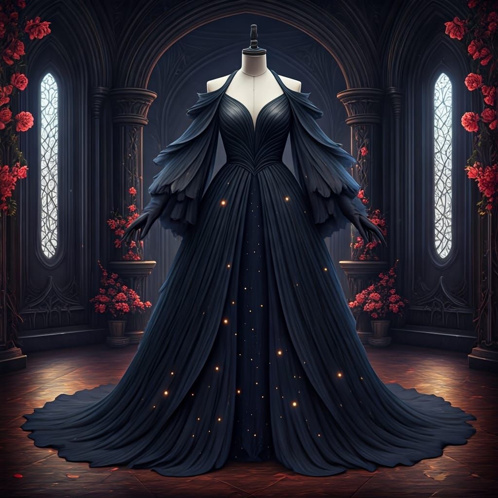 This image shows a black gown on a dress stand, inspired by night-blooming flowers. The gown features petal-like sleeves, a soft hem, and luminescent accents, displayed in a dark, floral showroom.