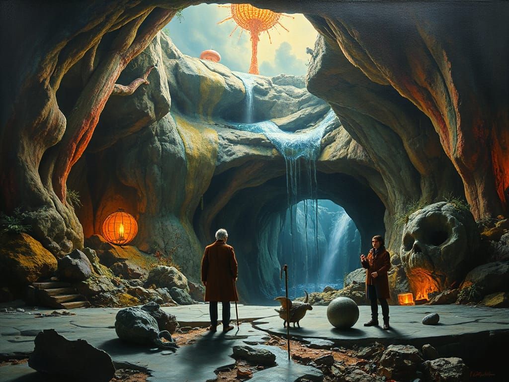 A surreal oil painting of explorers in a subterranean world. The image features intricate details, dramatic lighting, and saturated colors in a dreamlike, fantastic landscape.
